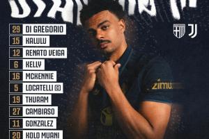 尤文首发:29-迪格雷戈里奥、15-卡卢卢、12-维加、6-凯利、16-麦肯尼、5-洛卡特利、19-图拉姆、27-坎比亚索、11-冈萨雷斯、20-穆阿尼、9-弗拉霍维奇