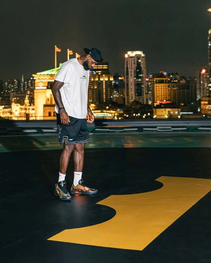 耐克官方发布的画面显示,昨晚詹姆斯身穿黑色短裤、白色印有“Forever King(永恒之王)”字样的T恤,在上海外滩霓虹夜景下与东方明珠合影,并展示了自己最新的第23代签名战靴。