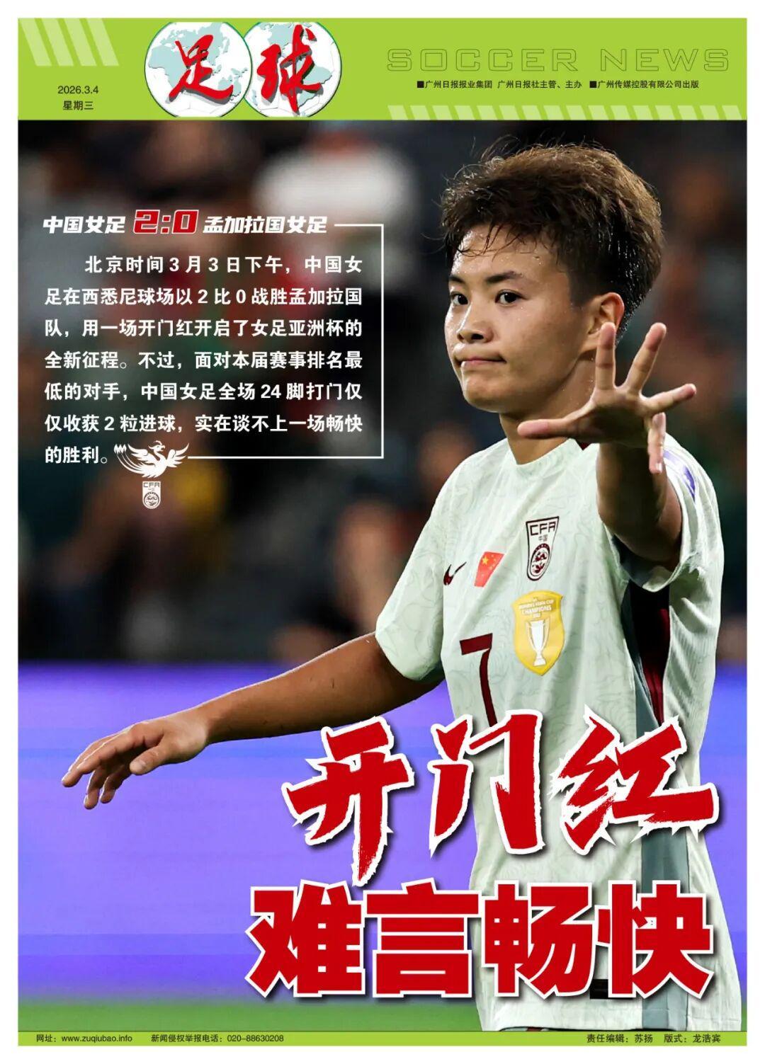 记者王伟报道北京时间3月3日下午,中国女足在西悉尼球场以2比0战胜孟加拉国队,用一场开门红开启了女足亚洲杯的全新征程。不过,面对本届赛事排名最低的对手,中国女足全场24脚打门仅仅收获2粒进球,实在谈不上一场畅快的胜利。