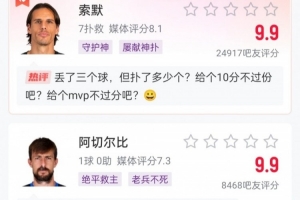 次回合国米多名老将发挥出色,36岁的索默高接抵挡,37岁的阿切尔比绝平进球,都得到了吧友打出9.9分。