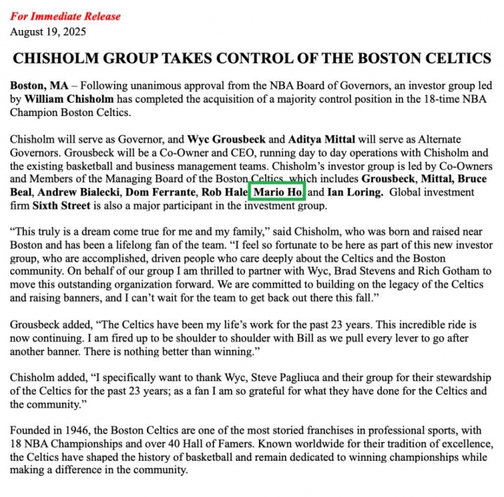 该财团由凯尔特人联席所有者及管理委员会成员牵头,知名成员包括“赌王”何鸿燊之子何猷君(Mario Ho)。